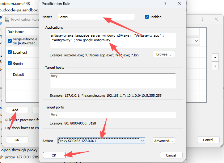 antigravity.exe; language_server_windows_x64.exe;“Antigravity.app”; “Antigravity”; com.google.antigravity - Action: 在下拉菜单中,选择刚才配置好的代理服务器(比如 Proxy SOCKS5 127.0.0.1:7890)。